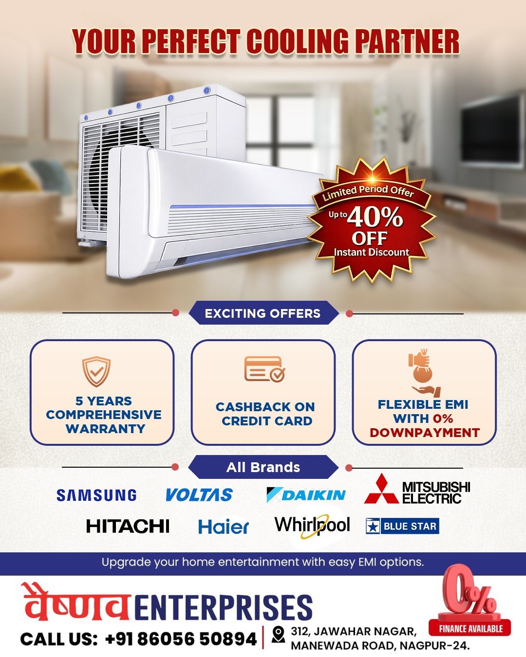 Get up to 40% OFF on top AC brands with instant discount. โ 5 Years Comprehensive Warranty โ Cashback on Credit Card โ Flexible EMI with 0% Down Payment
